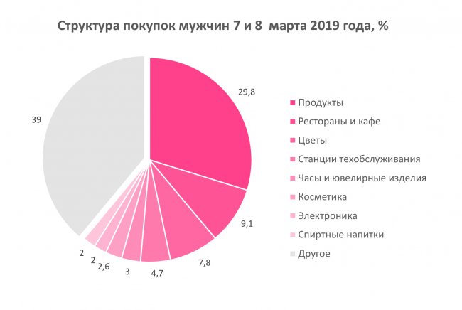 7 марта мужчинам-клиентам банка впервые с начала 2019 года удалось преодолеть отметку в 200 миллионов рублей трат за один день. Самый дорогой ответный подарок был приобретен в одном из брендовых бутиков и стоил 1.4 миллиона рублей, средний же чек был примерно равен женскому и составил 1100 рублей. Исходя из ТОП-10 категорий трат мужчин, подавляющее большинство дам получило в подарок как минимум цветы (7.8% от всех покупок - в три раза больше, чем 14 февраля), многим также повезло обзавестись новыми ювелирными изделиями (3% затрат), духами (магазины косметики – 2.6%, тогда как обычно мужчины тратят в таких магазинах не более 0.5% своего бюджета) и гаджетами (2%). В общем же на 8 марта мужчины потратили на 46.5 миллионов больше, чем женщины на 23 февраля.