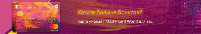 Заказать одну из самых популярных карт Банка «Санкт-Петербург» - «Яркая» Mastercard World – теперь можно с доставкой. Курьер привезет карту в любое удобное для Вас место и время в Санкт-Петербурге на следующий рабочий день. Услуга бесплатна.