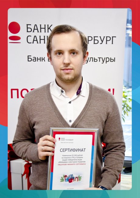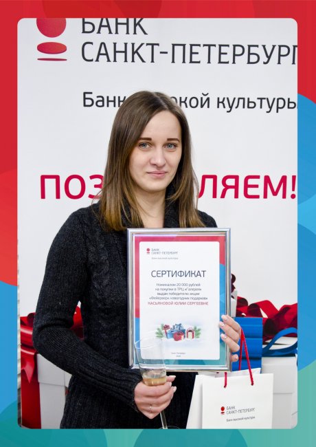Приближается весна, и зимняя акция Банка «Фейерверк новогодних подарков» подошла к концу. 09 февраля сотрудники Банка поздравили победителей заключительного месяца акции и вручили им сертификаты на покупки в ТЦ «Галерея» и ТРЦ «Калининград Плаза» номиналом 10 000 и 20 000 рублей. За время акции мы разыграли множество таких сертификатов среди участников, оформивших потребительский кредит или кредитную карту с грейс-периодом. Эта акция завершилась, но Банк и дальше будет радовать клиентов специальными предложениями и приятными подарками. Следите за новостями на нашем сайте и участвуйте в новых призовых розыгрышах! ПАО «Банк «Санкт-Петербург» Адрес: Малоохтинский проспект, 64А, 195112, Санкт-Петербург Телефон: 8 /800/ 222 5050, Электронная почта: cc@bspb.ru Информирование клиентов о специальных предложениях Банка может осуществляться с номера 8 /812/ 339 3090 ПАО «Банк «Санкт-Петербург»