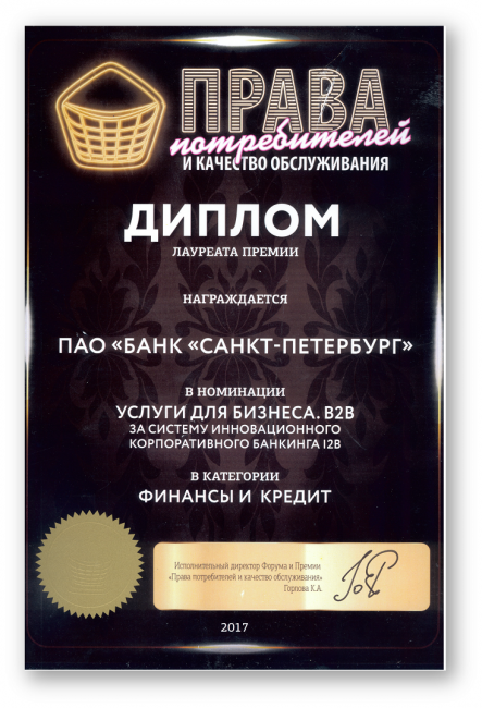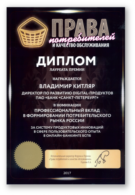 Корпоративный онлайн банкинг «i2B» Банка «Санкт-Петербург» победил в номинации «Услуги для бизнеса», в категории «Финансы и кредит». В номинации «Профессиональный вклад в формировании потребительского рынка России» лауреатом стал директор по развитию digital-продуктов Владимир Китляр. Этой награды он удостоен за систему продуктовых инноваций в сфере пользовательского опыта онлайн банкинга для физлиц.