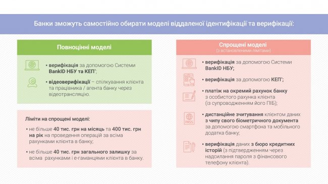 Почему мы называем эти модели моделями с ограниченной идентификацией? Потому что к счетам, которые были открыты с помощью идентификации клиентов по такой процедуре, будут применяться лимиты — 40 тысяч в месяц и 400 тысяч в год. Мы общались с банками, и по нашим оценкам порядка 90% украинских клиентов вписываются в эти лимиты. То есть, полные модели, о которых мы будем дальше говорить, будут использоваться скорее только для VIP-клиентов или тех, у кого еще нет счетов ни в одном банке.
