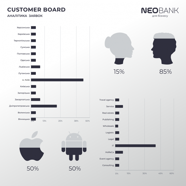 Елена: При подготовке к запуску Customer Board мы делали все, чтобы привлечь максимально широкий круг предпринимателей как по профилю деятельности, так и географически. Но наиболее активными, как вы видим по первой аналитике, оказались киевские айтишники.