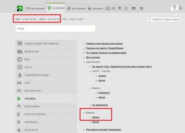 Продемонстрируем, насколько просто купить валюту онлайн на примере популярного государственного украинского банка. Как только вы зайдете в онлайн-банк Приват24, выбирайте вкладку «Все услуги». Здесь вы увидите актуальный курс валют, после чего в пункте меню «Валюта» выбирайте «Обмен».