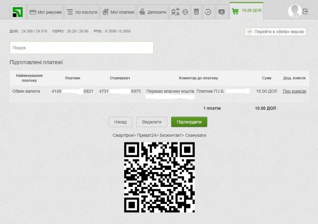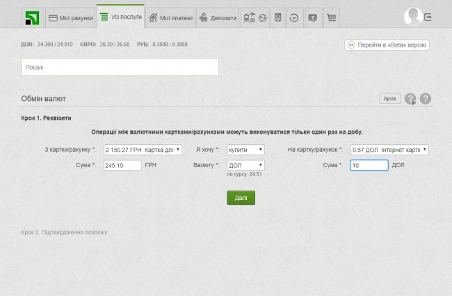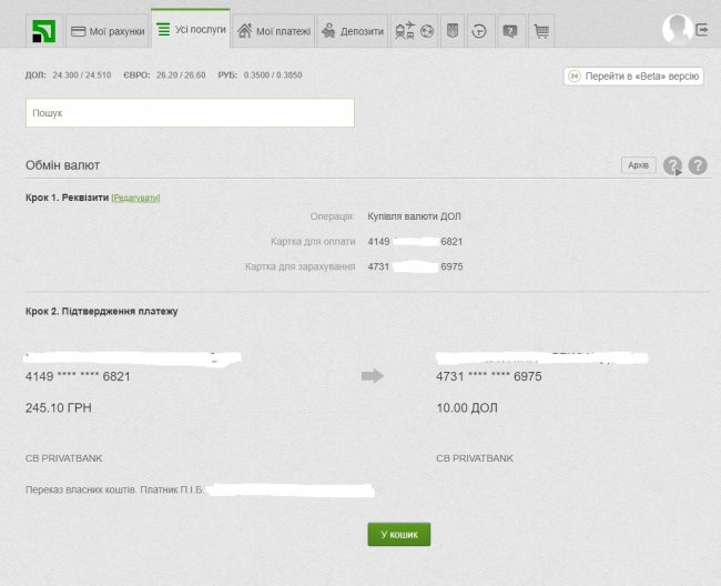 Мы купили 10 долларов по курсу 24,51 грн/дол. Валюта будет зачислена на валютную интернет-карту. Здесь же вы увидите итоговую сумму, которую банк спишет с вашей карты.
