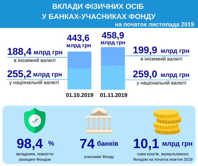 По состоянию на 1 ноября текущего года, сумма вкладов физических лиц в банках-участниках Фонда гарантирования вкладов (ФГВФЛ) составила 458,9 млрд грн. Об этом сообщает пресс-слуюба Фонда гарантирования.