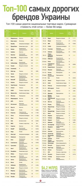 Консалтинговое агентство MPP Consulting и журнал НВ опубликовали список ТОП-100 самых дорогих украинских брендов. Суммарная стоимость торговых марок превысила $6,2 млрд.