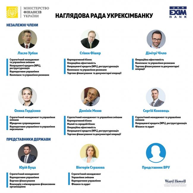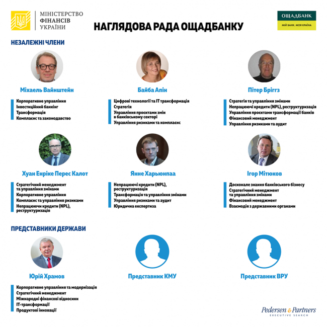 В состав директоров Ощадбанка в качестве независимых членов сроком на три года вошли Янне Харьюнпаа, Хуан Энрике Перес Калоти и Игорь Митюков. Независимым членом набсовета Укрэксимбанка, 100% акций которого принадлежат Кабмину, был избран Ласло Урбан. С остальными членами набсоветов финучреждений можно ознакомиться ниже.