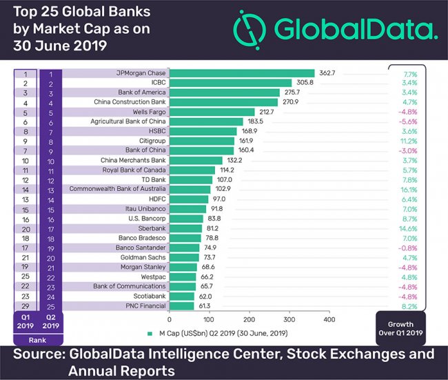 Согласно данным, из 25 банков, которые входят в список крупнейших банков от GlobalData, 19 банков сообщили о росте во втором квартале 2019 года. Отметим, что на первом месте оказался крупный американский банк JPMorgan Chase с рыночной капитализацией $362,7 млрд.