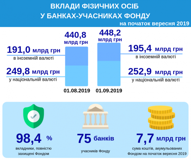 Согласно данным ФГВФЛ, общая сумма вкладов превысила показатель в 448,2 млрд грн. Из них 252,9 млрд грн приходятся на гривневые вклады и 195,4 млрд грн на вложения в иностранной валюте.