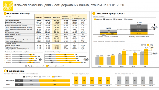 В последнем квартале 2019 года размер активов госбанков увеличился за счет роста объема денежных средств и их эквивалентов на 31,5 млрд грн — 63%, средств в НБУ на 27 млрд грн — в 2,1 раза и межбанковских кредитов на 25,1 млрд грн — на 41%.