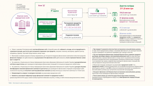 Также Нацбанк отметил, что поручители заемщиков «имели признаки фиктивности». В частности, минимальный размер уставного капитала у одного из двух поручителей составил 1 тыс грн.