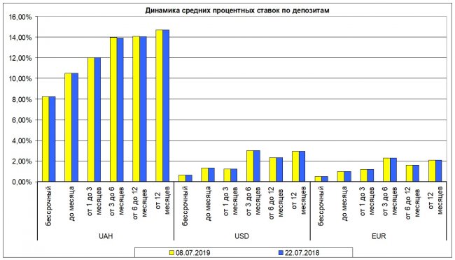 Банки Украины снижают ставки по депозитам как в гривне, так и в валюте Украинские банки снижают ставки по депозитам — подробности. Фото: ratecity.com.au На протяжении двух последних недель снизилась доходность вкладов в долларах и гривне. Это подтверждает обзор актуальных депозитных программ в банках Украины, который провело онлайн-ищдание LIGA.net (данные на 22.07.2019 г.). Отмечается, что несмотря на то, что доходность сбережений в долларах и гривне уменьшилась, вклады в евро не потерпели изменений. Как изменились ставки по депозитам — статистика. Фото: liga.net Средние ставки по депозитам в гривне: на срок выше 12 месяцев — вклады подешевели (до 14,71% годовых); на срок от 6 до 12 месяцев — доходность вкладов максимально опустилась (на 0,06 п.п. до 14,05% годовых); на срок от 3 до 6 месяцев — подешевели вклады (до 13,94 годовых); на срок от 3 до 1 месяца — не изменились (12% годовых); на срок до одного месяца — не изменились (10,5% годовых); бессрочные сбережения — не изменились (8,24% годовых). Средние ставки по депозитам в долларах: на срок выше 12 месяцев — вклады подешевели ( 2,93% годовых); на срок от 6 до 12 месяцев — доходность вкладов снизилась (2,33% годовых); на срок от 3 до 6 месяцев — подешевели вклады (3,02% годовых); на срок от 3 до 1 месяца — не изменились (1,21% годовых); на срок до одного месяца — не изменились (1,33% годовых); бессрочные сбережения — не изменились (0,64% годовых). Средние ставки по депозитам в евро: на срок выше 12 месяцев — не изменились ( 2,07% годовых); на срок от 6 до 12 месяцев — не изменились (1,60% годовых); на срок от 3 до 6 месяцев — не изменились (2,29% годовых); на срок от 3 до 1 месяца — не изменились (1,19% годовых); на срок до одного месяца — не изменились (0,97% годовых); бессрочные сбережения — не изменились (0,50% годовых). Украинские банки снижают ставки по депозитам — подробности. Фото: liga.net Ранее сообщалось, что украинцы нашли замену банковским депозитам. Согласно данным, в 2019 году часть жителей Украины не намерена продлевать действия договора вклада, так как они планируют инвестировать средства в ОВГЗ. Депозиты уменьшились на 2,5 млрд грн. ВИДЕО По материалам liga.net.