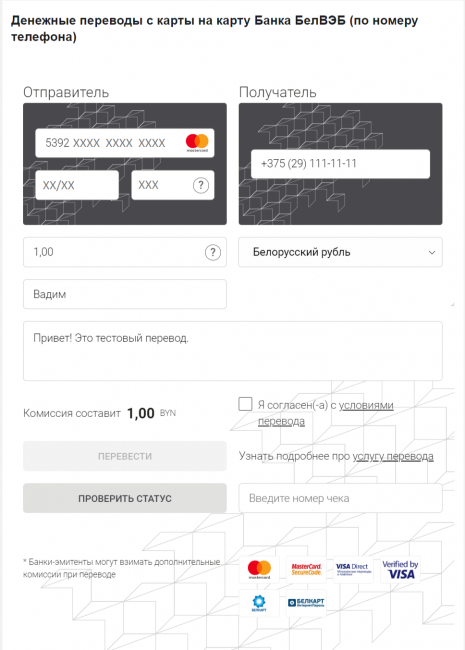 Отправить перевод могут держатели карточек платежных систем Masterсard, Visa и БЕЛКАРТ любого банка Беларуси. Деньги зачисляются на счет получателя – держателя карточки платежных систем Mastercard или Visa любого белорусского банка. Получателю на номер телефона придет SMS со ссылкой для ввода номера своей карточки и зачисления перевода.