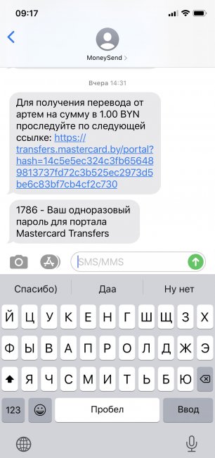 - Перейти по ссылке в SMS-сообщении от сервиса MoneySend и указать номер карточки, на которую нужно зачислить деньги.