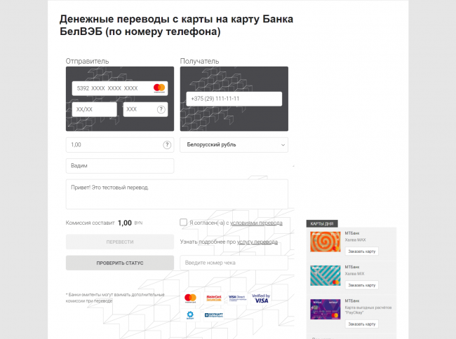 В партнерстве с Банком БелВЭБ представляет новый сервис р2р-переводов – переводы денег на карточку по номеру мобильного телефона. Сервис доступен в разделе «Переводы с карты на карту» на Финансах . Отправить перевод могут держатели карточек платежных систем Masterсard, Visa и БЕЛКАРТ любого банка Беларуси. Деньги зачисляются на счет получателя – держателя карточки платежных систем Mastercard или Visa любого белорусского банка. Получателю на номер телефона придет SMS со ссылкой для ввода номера своей карточки и зачисления перевода. Сервис работает предельно просто. Для перевода денег по номеру мобильного телефона отправителю нужно: Перейти в раздел «Переводы с карты на карту» на Финансах . В подразделе «Переводы по номеру телефона» выбрать соответствующее решение Банка БелВЭБ, кликнуть на кнопку «Сделать перевод»: В открывшейся форме ввести реквизиты карточки, с которой будет осуществлен перевод, сумму перевода, номер мобильного телефона получателя и имя отправителя. Можно оставить текст сообщения для получателя вашего перевода. Комиссия за услугу составит 1,5% от суммы операции (минимум 1 белорусский рубль). Для получения денежных средств получателю перевода нужно в срок не позднее 5 календарных дней с даты отправления перевода выполнить одно из следующих действий: Перейти по ссылке в SMS-сообщении от сервиса MoneySend и указать номер карточки, на которую нужно зачислить деньги. или Заранее зарегистрироваться на сайте сервиса Mastercard Money Transfers, войти в личный кабинет и подтвердить согласие на получение перевода. В личном кабинете сервиса получатель может управлять поступившими денежными средствами (сохранять карточки для последующего получения переводов; устанавливать карточку по умолчанию для выполнения автозачислений; просматривать историю переводов; при необходимости отклонять поступивший перевод). Перевод доступен для зачисления в течение 5 календарных дней. Если за это время получатель не укажет карточку для зачисления, перевод автоматически отменяется. Отправителю возвращается сумма перевода и комиссии за него. Внимание! До 01.06.2020 Банк БелВЭБ проводит благотворительную акцию: весь доход, полученный от денежных переводов на площадке Финансы банк направит государственному учреждению «Республиканский центр организации медицинского реагирования». Таким образом, каждый человек, который воспользуется сервисом перевода по номеру телефона или по номеру карты, также окажет посильную помощь. СПРАВОЧНО: Переводы с карточки на карточку по номеру телефона – третий совместный проект Банка БелВЭБ и портала . В 2019 году на Финансах запущено онлайн-оформление потребительского кредита «Хуткi анлайн» и онлайн-оформление депозитов. За 11 месяцев (июнь 2019 - апрель 2020) сервисами воспользовались более 8 000 человек. В партнерстве с Банком БелВЭБ представляет новый сервис р2р-переводов – переводы денег на карточку по номеру мобильного телефона. Сервис доступен в разделе «Переводы с карты на карту» на Финансах . Отправить перевод могут держатели карточек платежных систем Masterсard, Visa и БЕЛКАРТ любого банка Беларуси. Деньги зачисляются на счет получателя – держателя карточки платежных систем Mastercard или Visa любого белорусского банка. Получателю на номер телефона придет SMS со ссылкой для ввода номера своей карточки и зачисления перевода. Сервис работ