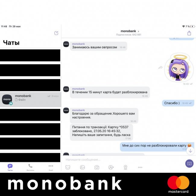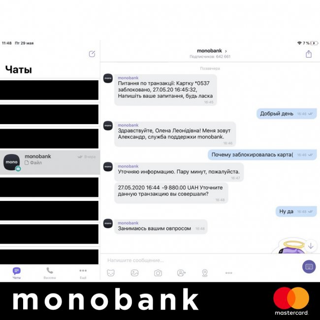 Как удалось выяснить позже, после кражи телефона, несмотря на блокировку устройства, было совершено семь денежных переводов на рызные карты этого же банка. После попытки перевести 10 тыс грн, карта была заблокирована. Но мошенники с помощью SIM-карты зашли в Viber и, давая указания службе поддержки monobank, разблокировали карту.