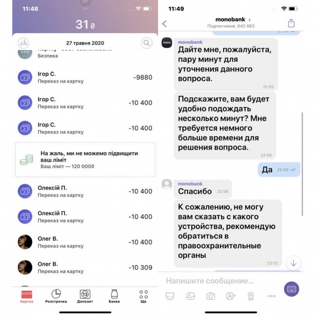 Потерпевшая с сыном обратились в Монобанк с просьбой отменить мошеннические транзакции. Но банк отказался это делать и посоветовал обратиться в полицию.