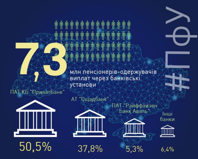 По данным ПФУ, услугами финучреждений для получения пенсий пользуется 7,3 млн человек. В процентном соотношении это выглядит следующим образом: