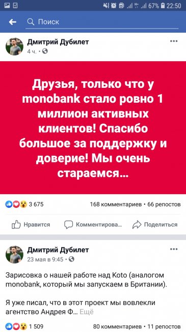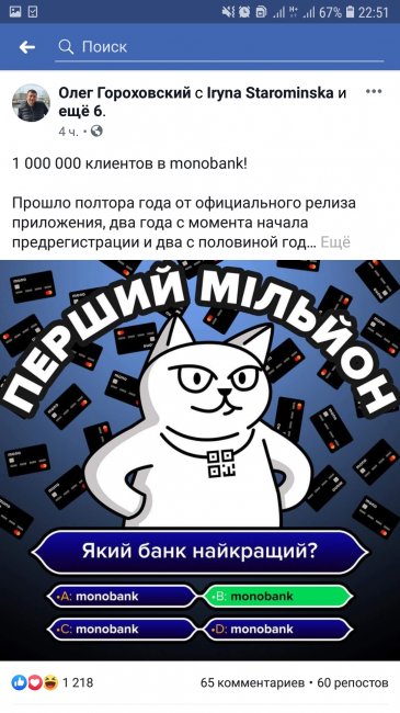 Первый в Украине мобильный банк monobank вышел на рынок в ноябре 2017. Всего за полтора года команде финучреждения удалось собрать 1 млн клиентов. О том, что банку удалось добиться такого результата, наперебой сообщают в социальных сетях его основатели и сотрудники.
