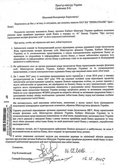 16 декабря 2016 года — Главные акционеры ПриватБанка Игорь Коломойский и Геннадий Боголюбов отправили письмо в адрес Премьер-министра Владимира Гройсмана с просьбой национализировать банк, дав гарантию не препятствовать данному процессу. Письмо было обнародовано в июле 2017 года на сайте Министерства финансов.