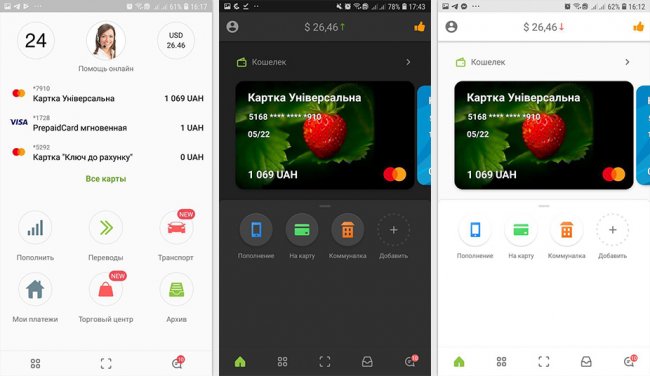 На главном экране нового приложения дублируются функции старого Приват24, но в немного другом формате. В отличие от предыдущей версии, где все карты доступны на одном экране, в новой версии нужно листать галерею, чтобы увидеть свои кредитки. Или перейти в меню «кошелек». Также заменены названия основных сервисов и вынесена на главную оплата коммунальных услуг. Преимущество нового дизайна в том, что на главный экран можно добавить те услуги, которыми клиент чаще всего пользуется. Недостаток — отсутствие информации по всем картам на первом экране.