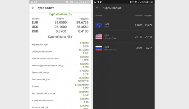 Курс валют в новой версии отображает только евро, доллар и рубль по отношению к гривне. Данные НБУ скрыты.