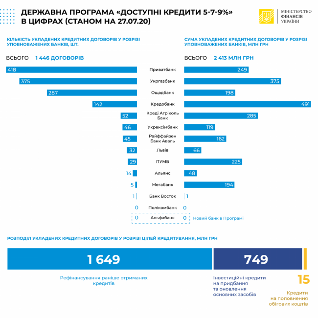 В рамках государственной программы «Доступные кредиты 5-7-9%» уполномоченные банки за прошедшую неделю заключили 196 новых кредитных соглашений на общую сумму 638 млн грн. Всего, по состоянию на 27 июля 2020 года, выдано 1446 кредитов на общую сумму 2,413 млрд грн, сообщается на сайте Министерства финансов Украины.