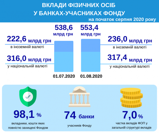 По состоянию на 1 августа 2020 года общая сумма вкладов физических лиц (включая физлиц-предпринимателей) в банках-участниках Фонда гарантирования вкладов выросла за месяц на 14,8 млрд грн до 553,4 млрд грн. Об этом сообщается на сайте ФГВФЛ.