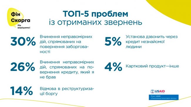 Украинцы меньше жалуются на банки, большинство обращений касается нарушений со стороны микрофинансовых организаций. Так, на платформе 28% жалоб приходится на банки и 72% — на финансовые компании. По типам продуктов распределение обращений выглядит следующим образом: кредит наличными — 89%, кредитные карты — 11%.