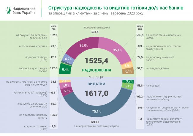 Крупнейшими источниками поступлений наличности в банки также стали операции клиентов с использованием платежных карт — 35,1% от общего объема поступлений. А также торговая выручка (35%) и выручка от всех видов услуг (9,4%).