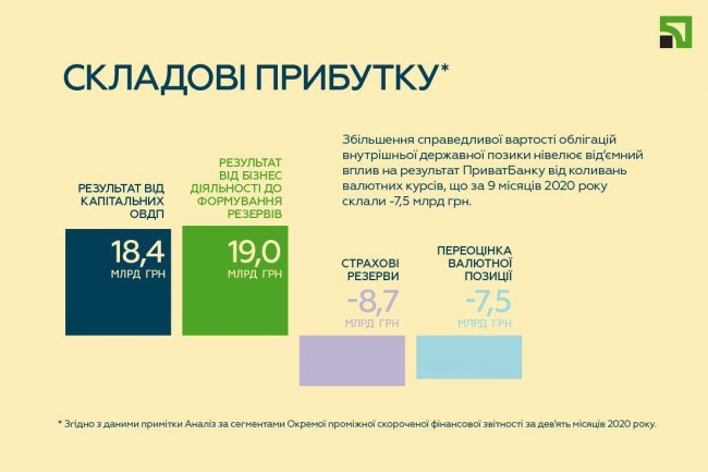 Всего от обслуживания клиентов и выполнения банковских операций за указанный период банк получил 19 млрд грн прибыли. Другая часть прибыли — результат влияния макроэкономических и других факторов. Так, изменения в мировой экономике и экономике Украины обусловили увеличение результата от облигаций внутреннего государственного займа, полученные в качестве взноса в уставный капитал банка при национализации.