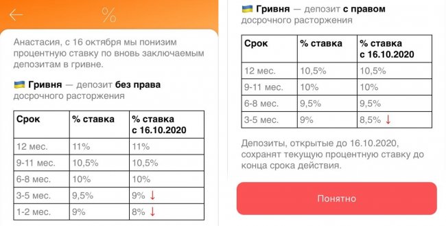 Кроме того, о снижении ставок по гривневым депозитам ранее сообщил monobank. С 16 октября на 0,5% и 1% снизились ставки по депозитам без права досрочного снятия, размещенные на 3-5 месяцев и 1-2 месяца соответственно. Также на 0,5% снизились ставки по гривневым депозитам на 3-5 месяцев с правом досрочного снятия.