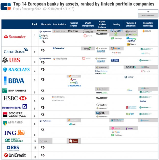 Это подтверждают данные CB Insights. Аналитики портала изучили, в какие финтех-стартапы инвестировали топовые европейские банки: