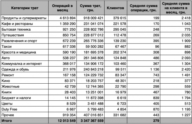 Больше всего средств клиенты первого в Украине мобильного банка тратят на продукты питания. Так, в категории «супермаркеты» только за декабрь 2018 года было израсходовано почти 1 млрд грн. Кроме того, продукты клиенты банка покупают чаще, чем другие товары. В месяц таких операций насчитывается 4,6 млн штук. Меньше всего тратят денег на цветы — 3,5 млн грн в месяц.