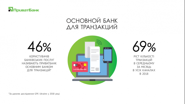 Как отмечает финансовый директор ПриватБанка Анна Самарина, в прошлом году 46% пользователей банковских услуг назвали финучреждение «основным банком для транзакций». Кроме того, по словам Самариной, в 2018 году среднемесячное количество транзакций через все каналы ПриватБанка выросло на 69%.