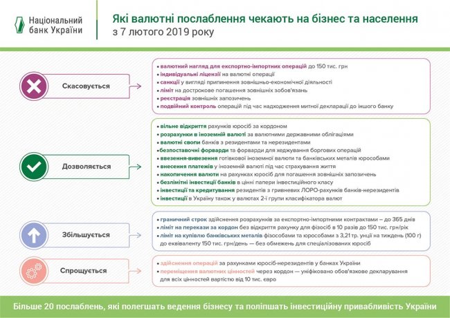 Все нормативно-правовые акты, необходимые для новой либеральной системы валютного регулирования, утверждены в НБУ НБУ утвердил новую систему валютного регулирования Фото: pewtrusts.org Новая система валютного регулирования, предусмотренная законом «О валюте и валютных операциях» включает 8 основных постановлений. Они вступят в силу с 7 февраля 2019 года и заменят старую базу из 56 нормативов валютного регулирования. Какие валютные ограничения отменят На валютном рынке будет сделано около 20 послаблений. Источник: bank.gov.ua В рамках новой системы валютного регулирования Национальный банк также осуществляет переход от системы тотального валютного контроля по каждой операции к валютному надзору, построенному по принципу «больше рисков — больше внимания, меньше рисков — меньше внимания». Кроме того, в НБУ уже разработали дорожную карту валютной либерализации. Она предусматривает пошаговое снятие всех валютных ограничений в соответствии с темпами улучшения макроэкономических условий в Украине. Как будут отменять валютные ограничения Источник: bank.gov.ua Конечная цель, которую преследуют в НБУ, подразумевает переход к режиму свободного движения капитала. В Нацбанке считают, что это упростит ведение бизнеса, поспособствует притоку иностранного капитала и экономическому росту. Ранее мы писали о том, что украинцы смогут купить и продать валюту в почтовых отделениях. Соответствующие изменения вступят в силу 7 февраля 2019 года вместе с Законом Украины «О валюте и валютных операциях».