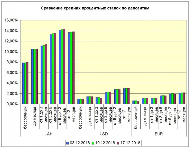 По итогам прошедшей недели средние ставки по валютным банковским вкладам упали. При этом сбережения в гривне продолжали дорожать, о чем свидетельствует обзор актуальных депозитных программ в 28 банках Украины, проведенный изданием liga.net (данные представлены на 17.12.2018).
